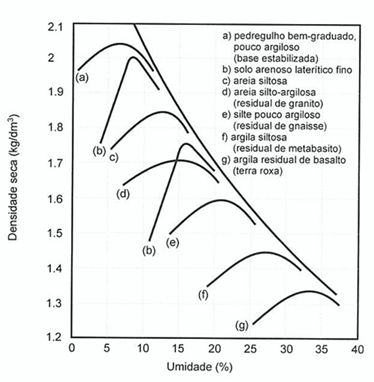 De maneira geral, os solos argilosos apresentam densidades secas baixas e umidades ótimas elevadas. Solos siltosos também apresentam valores baixos de densidade, frequentemente com curvas de laboratório bem abatidas. Densidades secas máximas elevadas e umidades ótimas baixas são representativas de areias com pedregulhos, bem graduadas e pouco argilosas.