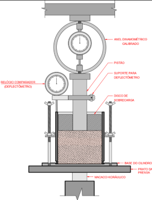 Após a imersão, o corpo de prova vai para uma prensa. Um pistão padronizado penetra o solo a uma velocidade constante de 1,27 mm/min. São registradas as pressões necessárias para fazer o pistão penetrar determinadas profundidades (especialmente 0,1 e 0,2 polegadas).