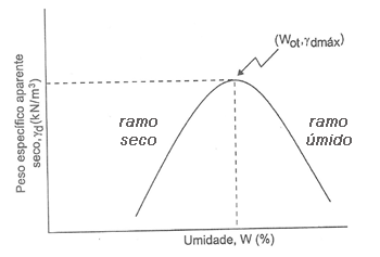 O gráfico (Curva de Compactação) relaciona Peso Específico Aparente Seco (γd) com a umidade (w). Do pico dessa curva, extraímos: