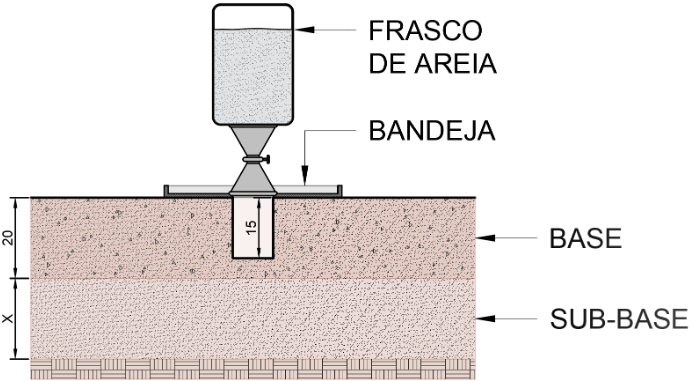 O ensaio adotado é o Frasco de Areia, o qual buscará descobrir a densidade do solo compactado no campo (na pista).